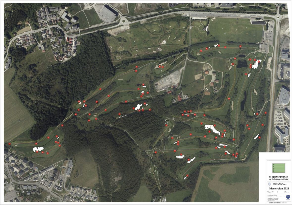 Vedlagte masterplan viser ønsket renovering av banen. Mye har allerede blitt oppgradert, resten tas etterhvert. Områder for renovering er risset inn med rød markering. Dreneringsarbeid utgjør en stor del, men endring av design og utbedring av bunkere, vann og annet er også omfattende på enkelte områder.