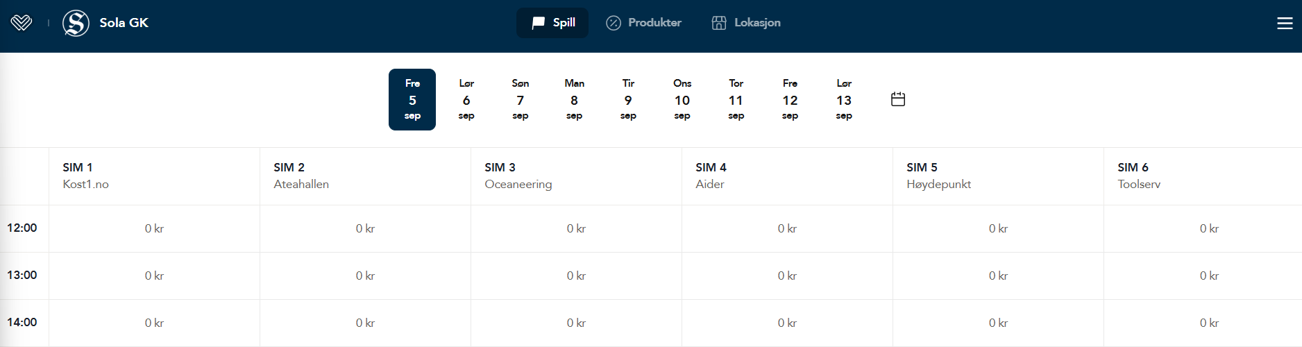 Her får en nå oversikt over alle 6 simulatorene og kan lettere se hvem som er ledig når du ønsker å spille. En trykker på de timer en ønsker å booke, logger inn og betaler. Enkelt og greit.